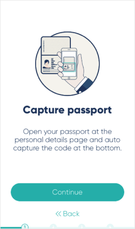 Your device camera should be pointed at the passport data page and held until the camera finds the code and reads it. Green brackets will indicate a successful attempt.
